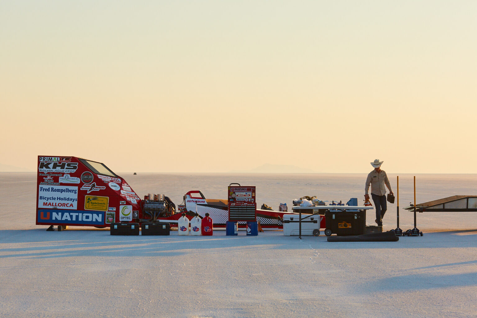 Last September Denise Mueller-Korenek attempted to become the fastest human on a bicycle. She pedalled to nearly 184mph, eliminating the previous men’s record of 167mph and her own women’s record of 147mph. The record took place on the Bonneville Salt Flats International Speedway on the border between Utah and Nevada, USA, during Bonneville Speed Week – an annual automotive Mecca event held on the dry riverbed People can be confused by this record. It is unique as it requires a vehicle to create a pocket of air. There is a custom fairing on the back of the race car, which creates a pocket for Denise to ride in, which allows her to cycle at that speed. The bicycle is in the slipstream of the converted dragster. Without this, the air resistance would be too strong to cycle above 50mph even on the the pan- flat surface used for the record. The name Bonneville, refers to the area of salt flats of in Utah, now home to the exhilarating Speed Week on the barren surface of America’s cathedral of speed. It’s an incredible place to visit, deadpan flat and rich sunlight makes for supreme speed conditions. A no brainer that it is a place of pilgrimage, steeped heavily with history of land speed records.