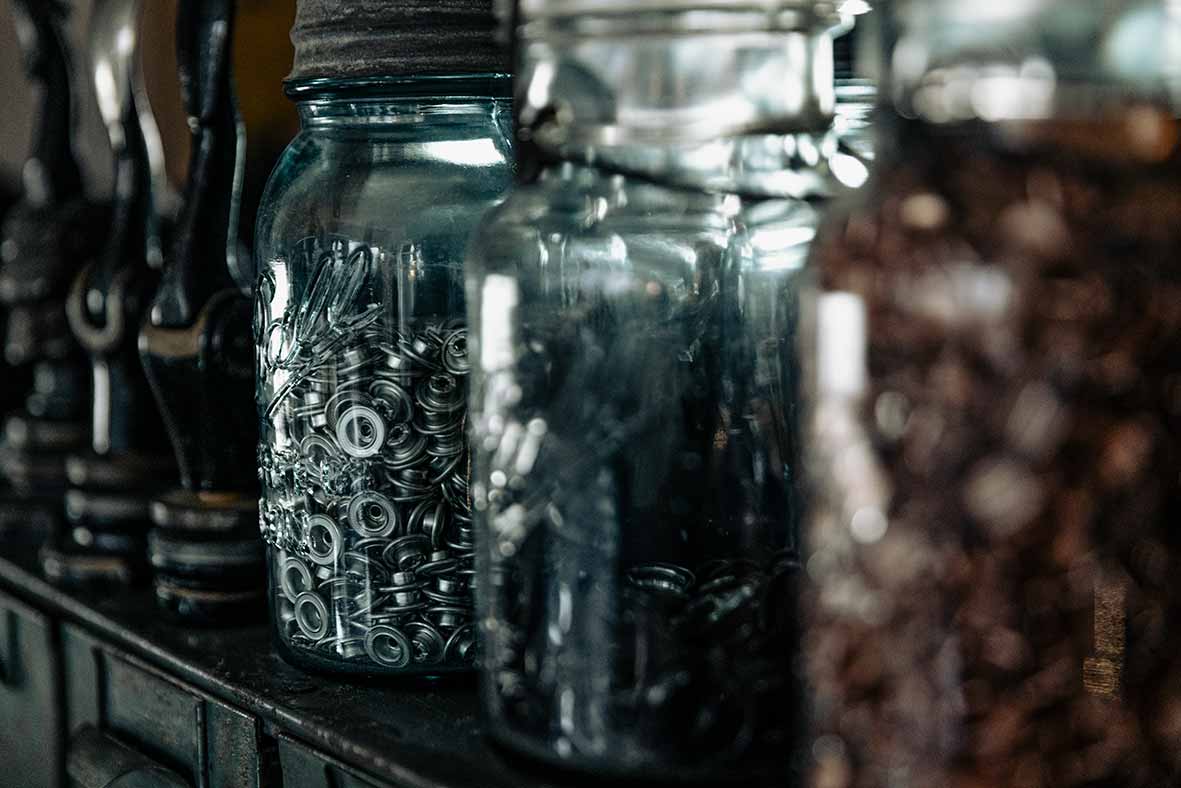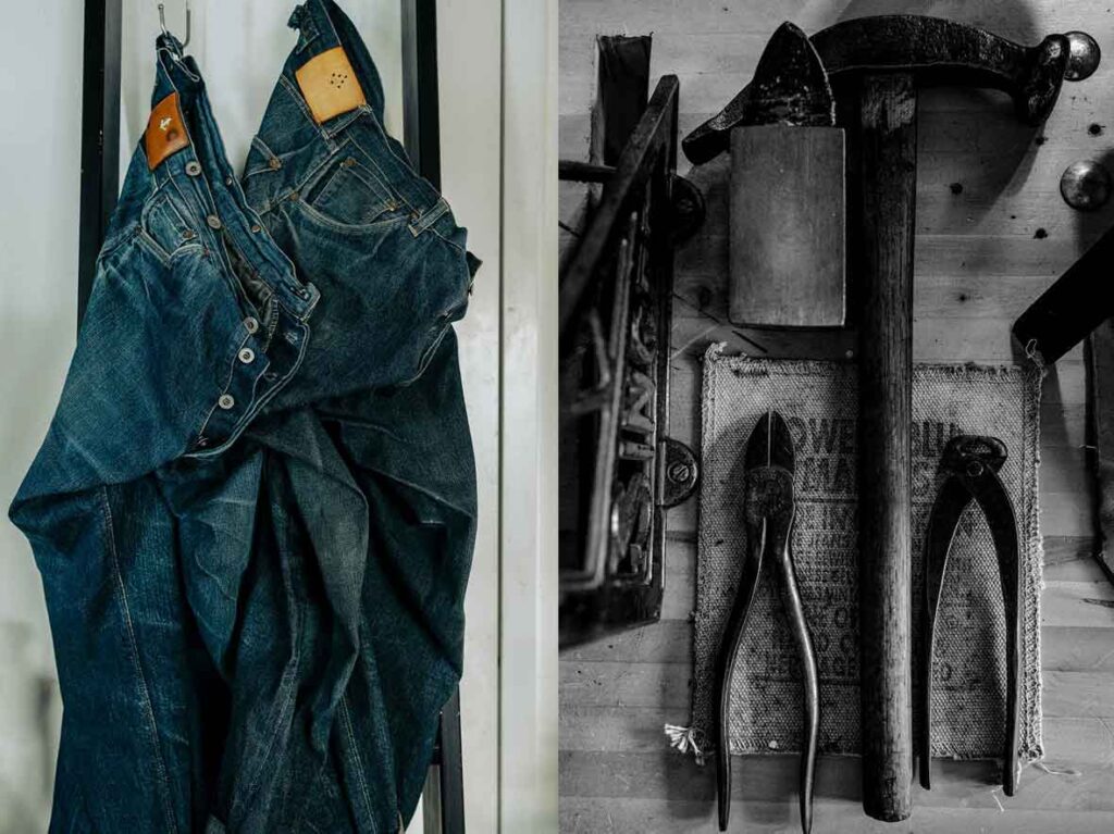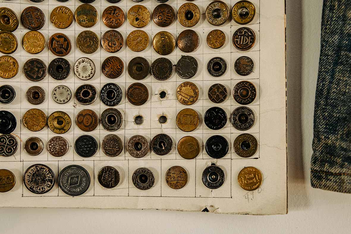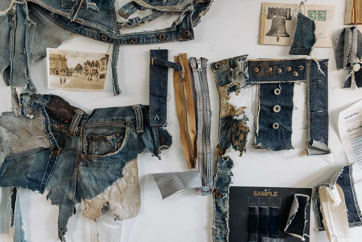 Copper rivets, pieces of fabric, seams, and parts of ancient jeans hang on the walls like samples of the smallest elements of jeans making. A crucial part of Echan’s artistic process is disassembling old jeans, to study and date each detail, and to see and feel the fabrics. That way he can recreate them with authenticity on his old machines. He collaborates with Brit Eaton, a denim hunter known as Indiana Jeans, who spends ten months a year on the road searching for denim in barns, attics and mines dating back to the gold rush.