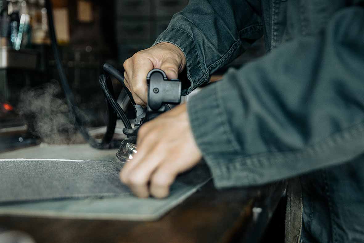 “The entire room is full of still lifes,” says Charlie, the photographer. Echan himself stands by his cutting table, cutting out parts of jeans with his iron scissors from a large roll. The hissing of the steam iron blends with Lionel Hampton’s vibraphone from a laptop. Each pair of jeans consists of fifteen parts, plus the belt loops, and one pair is usually what can be made in a day. The order book is so full, that Echan has closed his web shop for the next five months. That time also includes some time to recharge in Thailand and his native Japan. He calls himself a denim artist, not a craftsman.