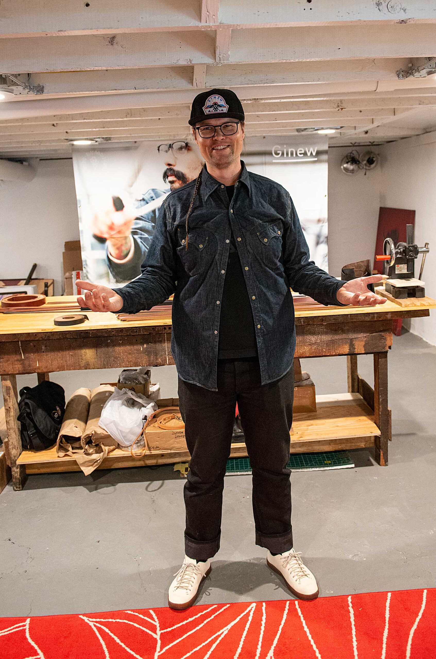 As we go through Ginew’s entire clothing collection, I find myself wanting too much of it far too much. It all looks great, and it’s all really well-made–you simply can’t miss the quality and all the careful thought that’s gone into it. I go crazy over a long jacket, the Heritage Coat, which has lining woven by Pendleton. The jeans feel stiff, but you can tell they’re built to last. I settle on the jeans in the end. Erik suggests I have them hemmed, but I’m more of a turn up kind of guy, so I tell him the length will be fine.