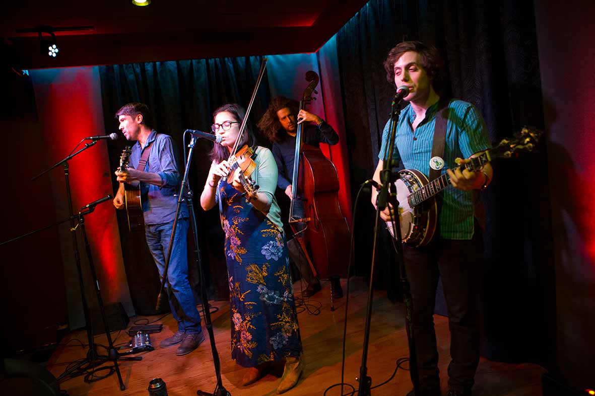 Andrea Asprelli takes a deep breath and adjusts her fiddle before taking the lead and directing the flow of the music. Banjo picker Doug Goldstein is up next, almost sneaking into the tune before his instrument takes its turn as lead. Dave Speranza leans into his upright and fills in the blanks, his big ruffle of hair like a ball of fire in the colorful lights, bobbing around back there, behind the bass. Guitarist Ross Martin leans into the neck of his guitar, and lays out a soft arpeggio with his hands before looking over to Andrea, who decides that it’s time for her to sing; she slides her fiddle down her hand and lays the bow to rest for a moment.